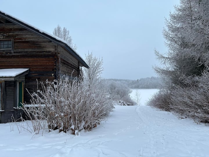Äkäsjoen piilo, käsin veistetty hirsimökki jossa erämaatunnelma joen varressa.
