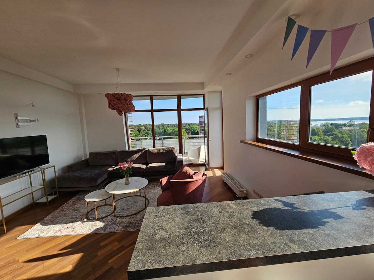 Tyylikäs ja viihtyisä designhuoneisto hiljaisessa paikassa, josta on näkymä joen ja kaupungin yli avautuvasta 10. kerroksesta. Täysin varustettu laadukkailla huonekaluilla, laitteilla (kuten pesukone, jossa on kuivain, kahvinkeitin, liesi, astianpesukone, älytelevisio ja jopa ilmanpuhdistin), astioilla, vuodevaatteilla ja kaikilla mukavaan asumiseen tarvittavilla kylpyhuoneen tarvikkeilla. Ja tietenkin - parveke, jolta on mahtava näköala.