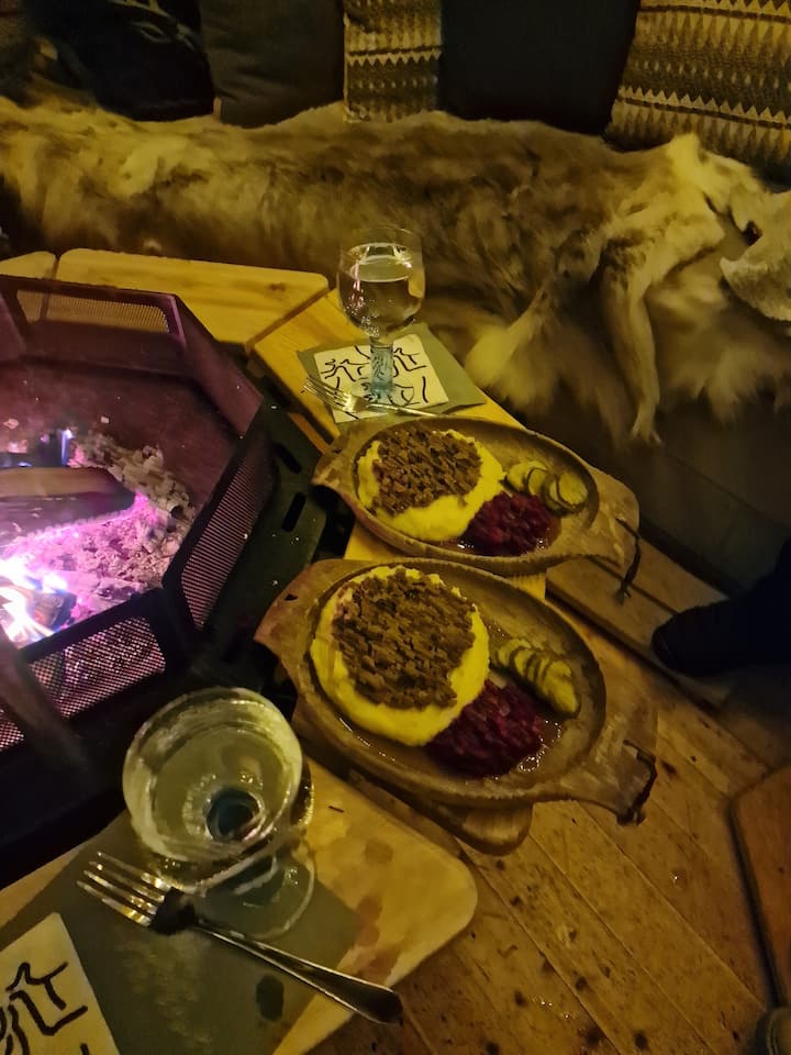 Perinteinen illallinen lappalaisessa mökissä avotulen äärellä