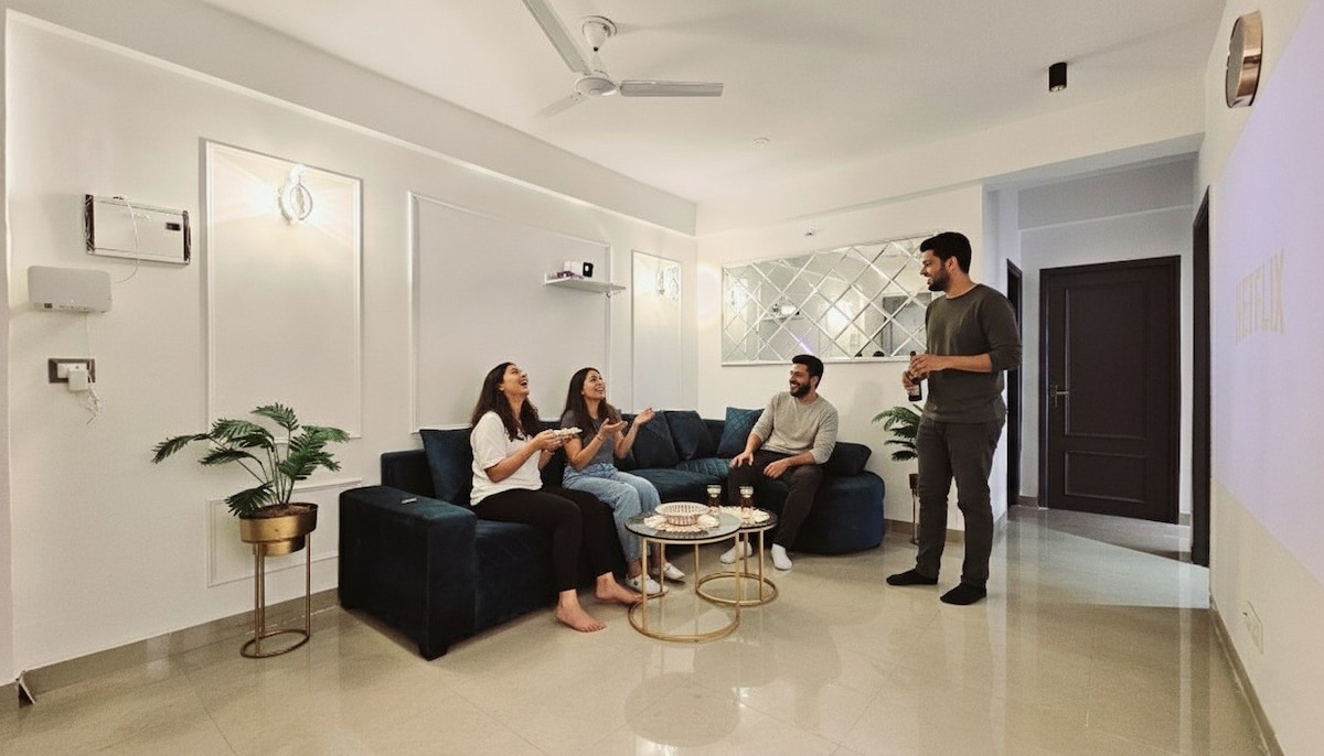 Unwind in this stylish, fully-equipped 2BHK designed for relaxation and entertainment. The highlight is the massive projector cinema screen (mention size if known, e.g., 100-inch) perfect for binge-watching, gaming, or a cinematic experience. Located conveniently near the NH-48 and Manesar corporate hubs, this apartment offers the perfect blend of work and play with high-speed Wi-Fi, a full kitchen, and on-site parking.