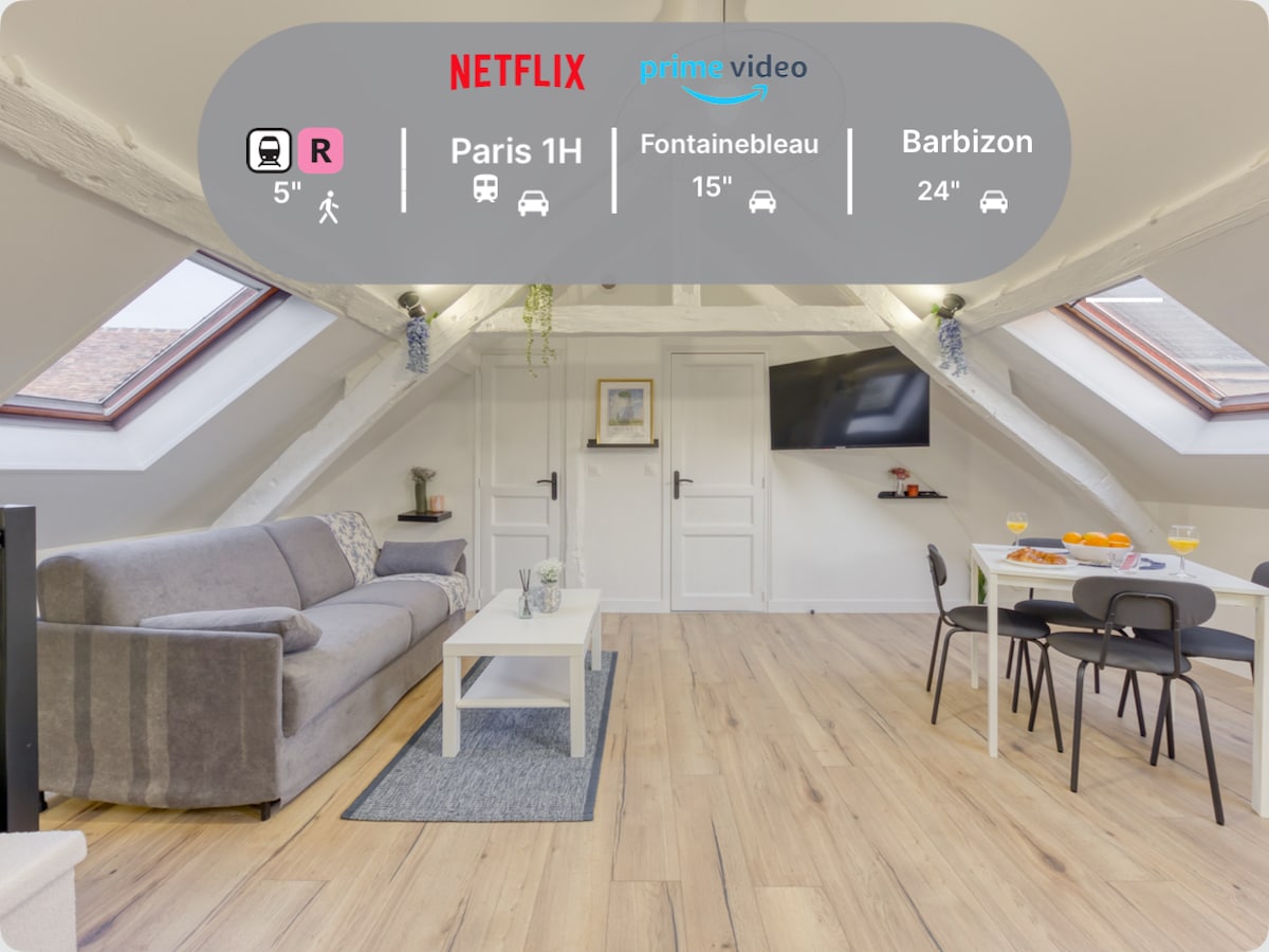 Rauhallisen kylän laidalla Seine-joen oikealla rannalla, muutaman kilometrin päässä Fontainebleausta ja Samois sur Seinestä, 40 minuutin junamatkan päässä Pariisista, tämä erittäin tilava huoneisto nukkuu jopa neljä ihmistä kahdessa tai useammassa kiinteässä vuoteessa erillisissä huoneissa. Olohuoneessa enemmän vieraita voitaisiin mahdollisesti majoittaa lisämaksusta per henkilö per yö. Paikan päällä kiipeilijöille on tarjolla 4 suojapatjaa minimaalisin lisäkustannuksin.