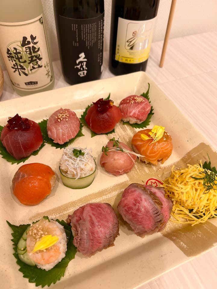 Ensiluokkainen tonnikala- ja wagyu-sushi matchan ja mochin kera