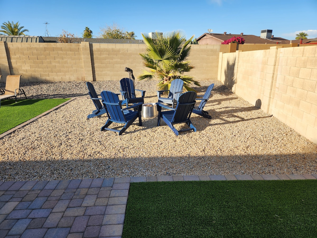 Tilava ja perheystävällinen 4 makuuhuoneen koti, jossa on kaksi oleskelutilaa ja oma takapiha rentoutumiseen ja rauhoittumiseen. Nauti huvimajasta ja täytettävistä porealtaista päivän jälkeen. Sijaitsee noin 12 minuutin päässä State Farm Stadiumilta, Westgate Entertainment Districtilta, Desert Diamond Arenalta, Topgolfilta ja Andretti Kartingilta. Lähellä ruokakauppoja, kauppoja, ravintoloita ja valtatietä – ihanteellinen perheille, ryhmille tai työmatkailijoille.