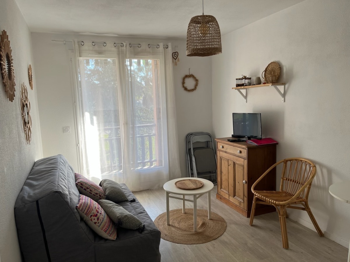 T2-huoneisto, täysin uudistettu, erittäin valoisa, kaunis terassi merinäköalalla, asuinalueella, jossa on uima-allas, 20 metriä mereltä - 1 erillinen makuuhuone, vuodevaatteet, 140 cm leveä sänky, TV - Kylpyhuoneessa kylpyamme, pyyhkeet saatavilla - WC - sisäänkäynnissä vaatehuone - Täysin varusteltu keittiö (mikroaaltouuni, Senseo-kahvinkeitin, jääkaappi/pakastin, 4 polttimen liesi, uuni, leivänpaahdin, astianpesukone, pesukone) - Olohuone, 140 cm:n pikavuodesohva, TV, WiFi - Terassi, jolta on meri- ja vuoristonäkymä, pöytä ja tuolit.