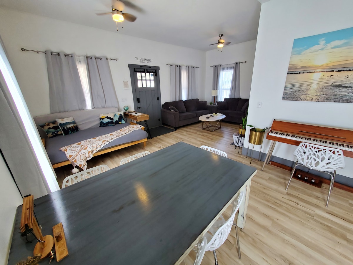 Pääkerroksen huoneisto. Keittiö on täysin varustettu kaikkia ruoanlaittotarpeita varten, graniittityötasot ja ruostumattomasta teräksestä valmistetut kodinkoneet. Ainutlaatuisia ruokailuvaihtoehtoja ja viihdepaikkoja vain lyhyen kävelymatkan päässä. Hypoallergeeninen matto makuuhuoneissa, puun näköinen ylellinen vinyylilankkulattia muualla huoneistossa ja yli 10 jalan korkuiset katot tuulettimilla olo-/ruokailutilassa ja kaikissa makuuhuoneissa. Avoin pohjaratkaisu. 43" Roku TV, jossa WiFi vieraiden käyttöön. Meillä on 1 leikkikehä 2 huoneistoon, joten lähetä viesti siitä. Ensimmäinen pyyntö saa käyttää sitä.