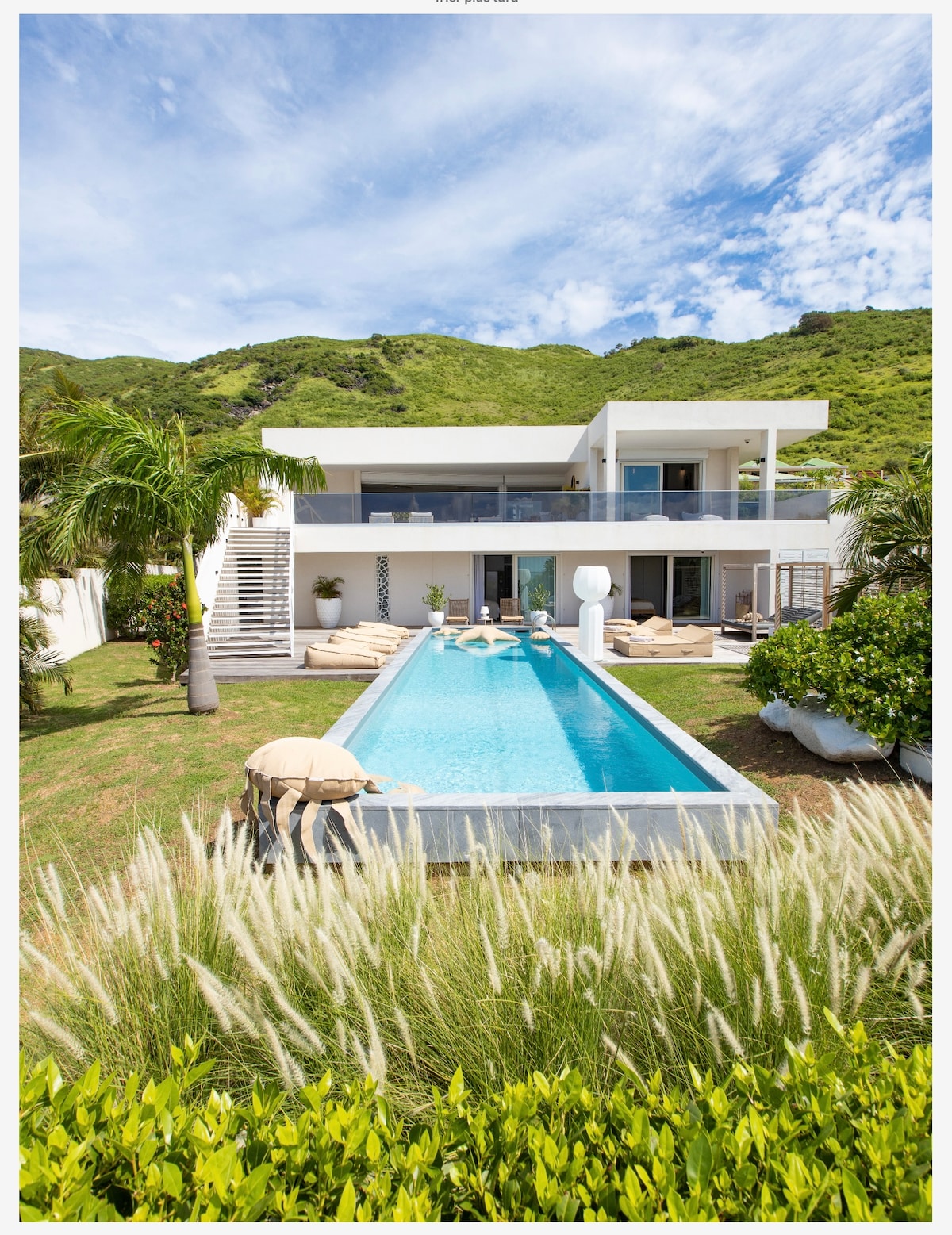 Marvel at the sunset from your private hot tub at this oceanfront villa on St. Martin. Walk barefoot to Plum Bay Beach for a swim in the surf, and return to cocktail parties under the starry sky. Perched in the prestigious Terres Basses area on the island's west coast, Giselle balances vintage Caribbean elegance, state-of-the-art comforts, and an open, free-flowing design that bathes your every moment in the spirit of the sea. The symmetrical house features a capacious central living room opening to a shaded veranda and expansive pool terrace with panoramic ocean views. The terrace is perfect for special parties or carefree days under the immense sky, while the covered lounge area forms a cool retreat for afternoon refreshments or cocktail parties. A light-filled kitchen forms the fulcrum of the home, with a 2-sided window bar serving the veranda and terrace. The main dining room includes a table for 12 beneath vaulted ceilings of whitewashed wood, with wide thresholds creating a breezy, alfresco ambiance. The spacious living room balances an ancient minimalism with vintage modern-chic furniture and Buddhist artwork, perfect for lively gatherings or tranquil relaxation into the wee hours. Four of the villa's bedrooms open directly to the pool terrace, while the fifth suite enjoys extra privacy with its own entrance and kitchenette. All have king beds, ensuite bathrooms, and air conditioning, providing comfortable havens for a family, group of friends, or destination wedding guests. While Giselle's location on the island's westernmost edge offers some of the finest views and beach access on St. Martin, it's also within easy reach of the island's main towns and nightlife spots. Enjoy the vibrant markets of nearby Marigot, the world-class shopping in Philipsburg, and some of the region's most renowned restaurants in Grand Case. Copyright © Luxury Retreats. All rights reserved. BEDROOM & BATHROOM • Bedroom 1 - Primary: King size bed, Ensuite bathroom with stand-alone shower, Walk-in closet, Television, Safe, Direct access to terrace, Ocean view • Bedroom 2: King size bed, Ensuite bathroom with stand-alone shower, Walk-in closet, Television, Safe, Direct access to terrace, Ocean view • Bedroom 3: King size bed, Ensuite bathroom with stand-alone shower, Walk-in closet, Television, Safe, Direct access to terrace, Ocean view • Bedroom 4: King size bed, Ensuite bathroom with stand-alone shower, Walk-in closet, Safe, Direct access to terrace, Ocean view • Bedroom 5 - Apartment: King size bed, Ensuite bathroom with stand-alone shower, Kitchenette, Private entrance OUTDOOR FEATURES • Terrace STAFF & SERVICES Included: • Gardener • Pool keeper • Welcome breakfast basket • 24/7 onsite maintenance & emergency services Extra Cost (advance notice may be required): • Adventure activities • Swimming pool - heating included from April 16- October 15