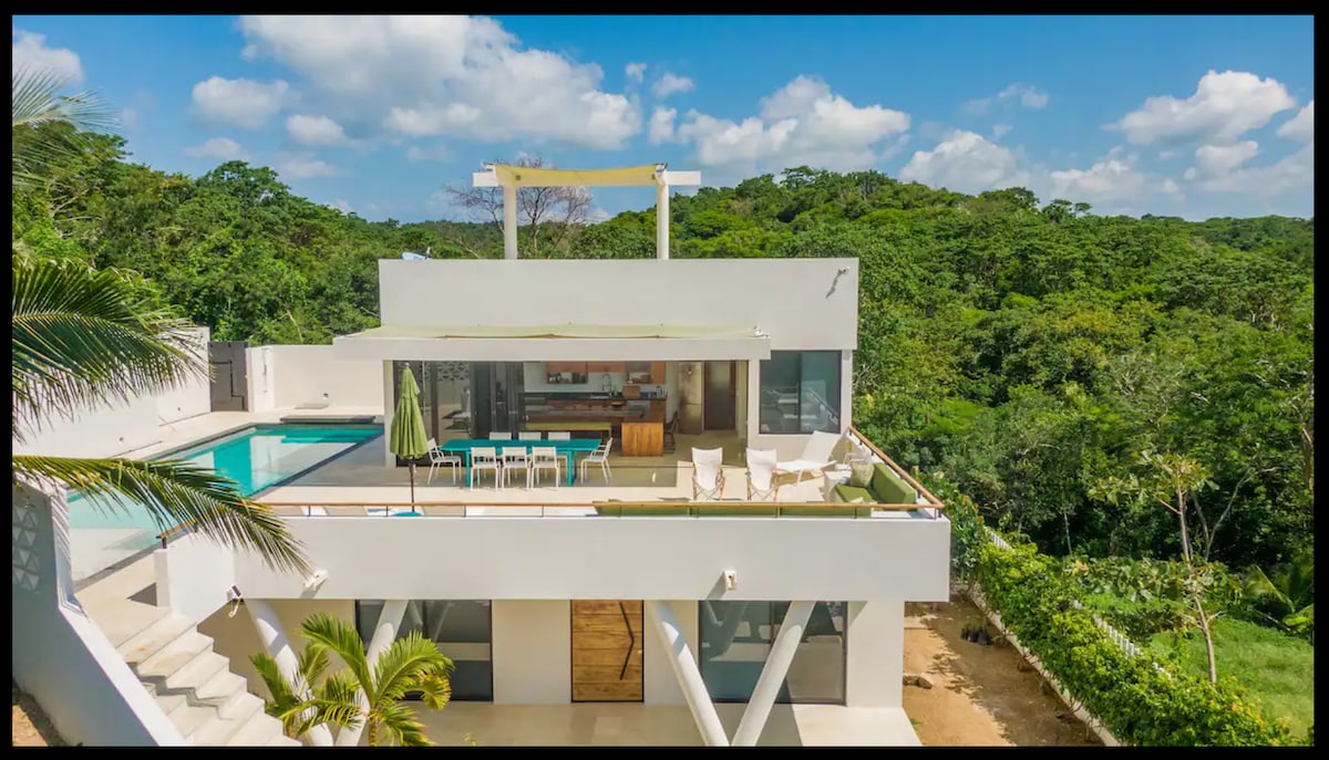 Herääminen tässä paikassa on unelma! Talo sijaitsee aivan meren rannalla ja nauttii parhaista auringonlaskuista joka päivä. Siinä on kaksi tasoa. Makuuhuone on ylhäällä sekä työtila (Starlink) ja riippumatot lepäämään. Katto on mahtava palapa. Talossa on pieni yksityinen uima-allas, josta voit nauttia parhaista näkymistä Playa Mermejitaan. Talo on hyvin avoin nauttimaan tuulen tuoreudesta ja parhaista näkymistä.