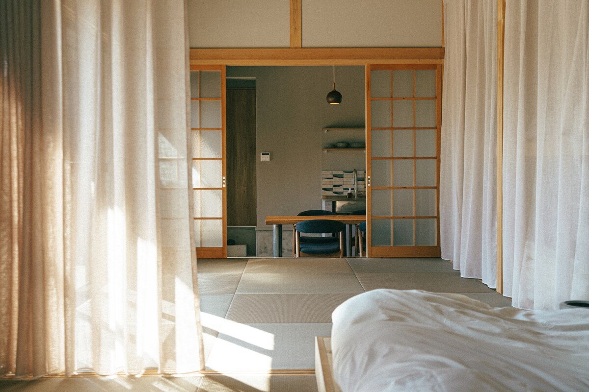 Kuvittele hitaampi, yksinkertaisempi ja rauhallisempi paikka ja aika. Paikka, joka sijaitsee smaragdinvihreiden riisipeltojen ja loputtoman hiekkarannan välissä. Menneisyyden kiireetön aika, kun perhe ja ystävät istuivat, juttelivat, söivät ja joivat perinteisellä tatamilla tai tähtien alla, ja taustalla rytisti kaatuvat aaltojen heikko ääni. Tämän löydät isoäidin talosta, joka on tyylikkäästi säilynyt 1900-luvun puolivälin mökki, joka on viiden minuutin kävelymatkan päässä Toyoumi Beachistä Kujukurin kaupungista.