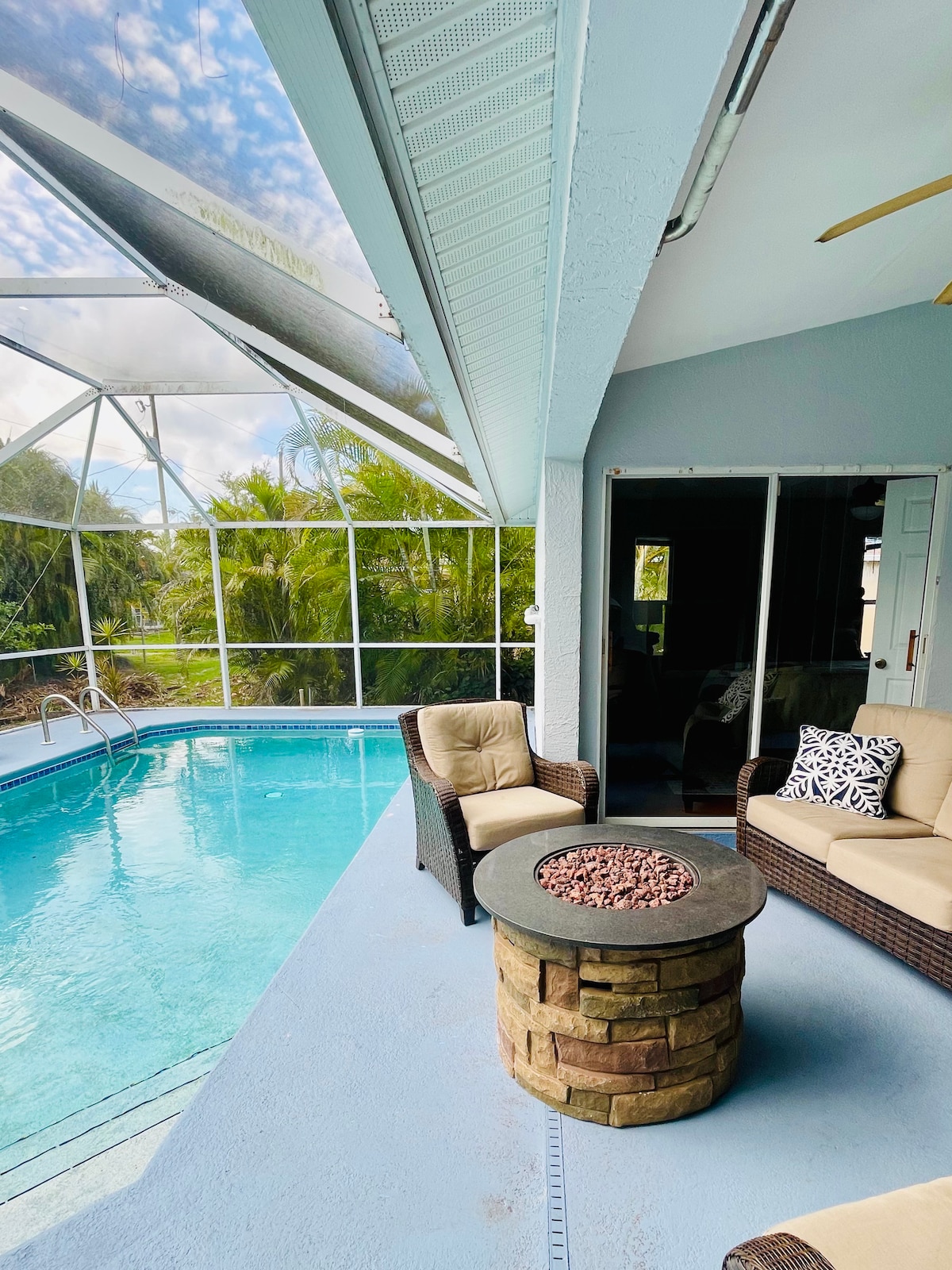 Tervetuloa lomallesi, jossa on avoin pohjapiirros ja uloskäynti lämmitetylle uima-altaalle, jossa on Weber-grilli, mukavat istuimet ja tulipöytä. Tässä kohteessa on 9 vuodepaikkaa, 3 kylpyhuonetta ja 2 kylpyhuonetta. Hiljainen naapurusto, jossa voit kuulla takapihan palmuja. Vain 20 minuuttia Ft. Myers Beach, Bonita Beach, Barefoot Beach. Kaikki saatavilla olevat rantatarvikkeet, mukaan lukien tuolit, sateenvarjo, jäähdytin ja pyyhkeet. Hyvin lähellä baseball-stadioneja, ostospaikkoja ja FGCU: ta. En malta odottaa, että nautit kaikista tästä sijainnista. Tervetuloa!