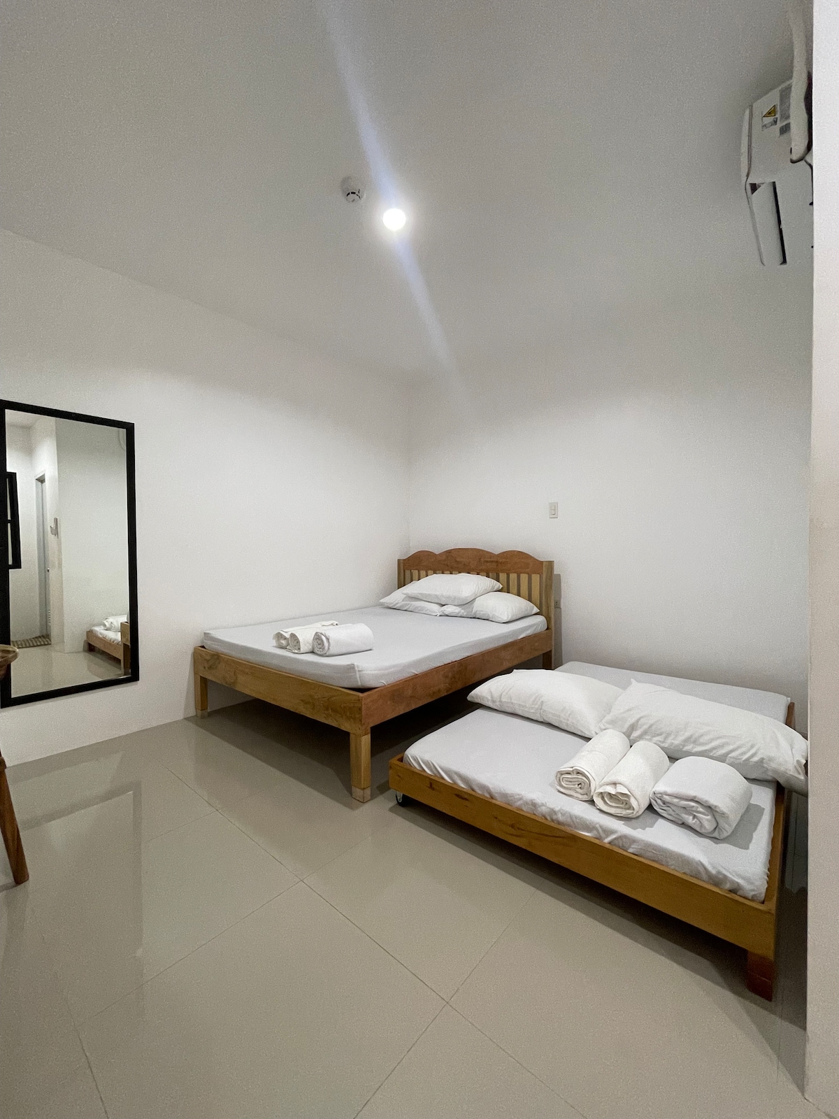 Double Family Room,on the Sea front and Beach. 2 rooms & 2 Cr's. 2 Dble-vuodetta ja 2 yhden hengen vuodetta + 2 ylimääräistä patjaa, joissa on aircons. Jaa keittotila ruoanlaittoa varten. Turistikaupungissa San Juanissa, lähellä markkinoita, ravintoloita, kauppoja, pankkiautomaatteja ja JJ's Night-Life Beach Clubia. Tämä tyylikäs kohde on lähellä kaikkea, ja päiväretkiä ja matkailukohteita varten on helppo noutaa. Sea View Restaurant on ground floor, open for breakfast closes 1030pm daily. Moottoripyöränvuokraus lähellä.