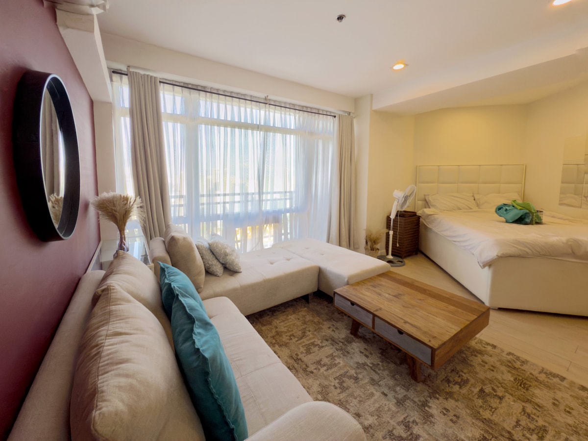 ALLE 7-VUOTIAAT LAPSET EIVÄT LASKETA MUKAAN HUONEEN MAJOITUSKAPASITEETTIIN. Koe ylellisyyttä tässä moitteettoman tyylissä olevassa tilavassa 2BR-sviitissä, joka sijaitsee BGC: n sydämessä. Nauti anteliaista näkymistä kaupunkimaisemaan laajojen ikkunoiden kautta. Nauti 5 tähden mukavuudesta nopean WiFin, Netflixin, mukavuuksien ja uima-altaan, kylpylän ja leikkipaikan avulla. Kävele kätevästi Shangri-Laan, HighStreetiin ja St. Lukes Hospitaliin. Ylitä katua, niin olet Grand Hyatt, Uptown ja Mitsukoshi -ostoskeskuksissa sekä huippuluokan klubeilla, kuten The Island ja Xylo.