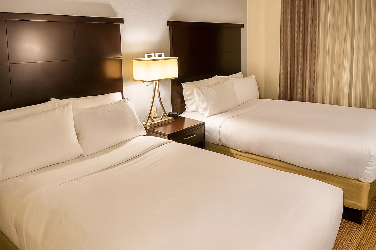 2 Queen Bed Room -huoneessamme on 2 mukavaa queen-vuodetta, jotka tekevät siitä idean jopa 4 aikuisen ryhmälle. Jokainen huone on palveluystävällinen ja koostuu hiustenkuivaajasta, silitysraudasta/silityslaudasta, kahvinkeittimestä, ilmaisesta nopeasta langattomasta internetistä, mikroaaltouunista/jääkaapista ja modernista nykyaikaisesta sisustuksesta.