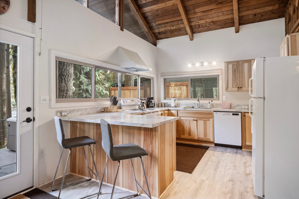 Tämä remontoitu mökki on kaunis! Se on arkkitehtonisesti ainutlaatuinen ja siinä on mielenkiintoisia linjoja, lattiasta kattoon ulottuvat ikkunat, avoin pääkerros, puuhellalla lämmitettävä kamiina ja king-vuode parvihuoneessa. Tämä on hyvä tukikohta tutustua kaikkeen, mitä Mt. Hoodilla on tarjottavana ja kaunis tila rentoutua sen jälkeen!