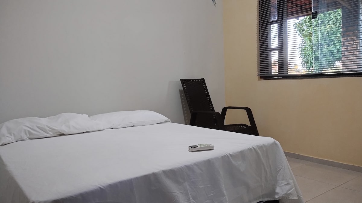 O quarto conta com ar condicionado, cama casal, frigobar e banheiro privativo com chuveiro elétrico.
