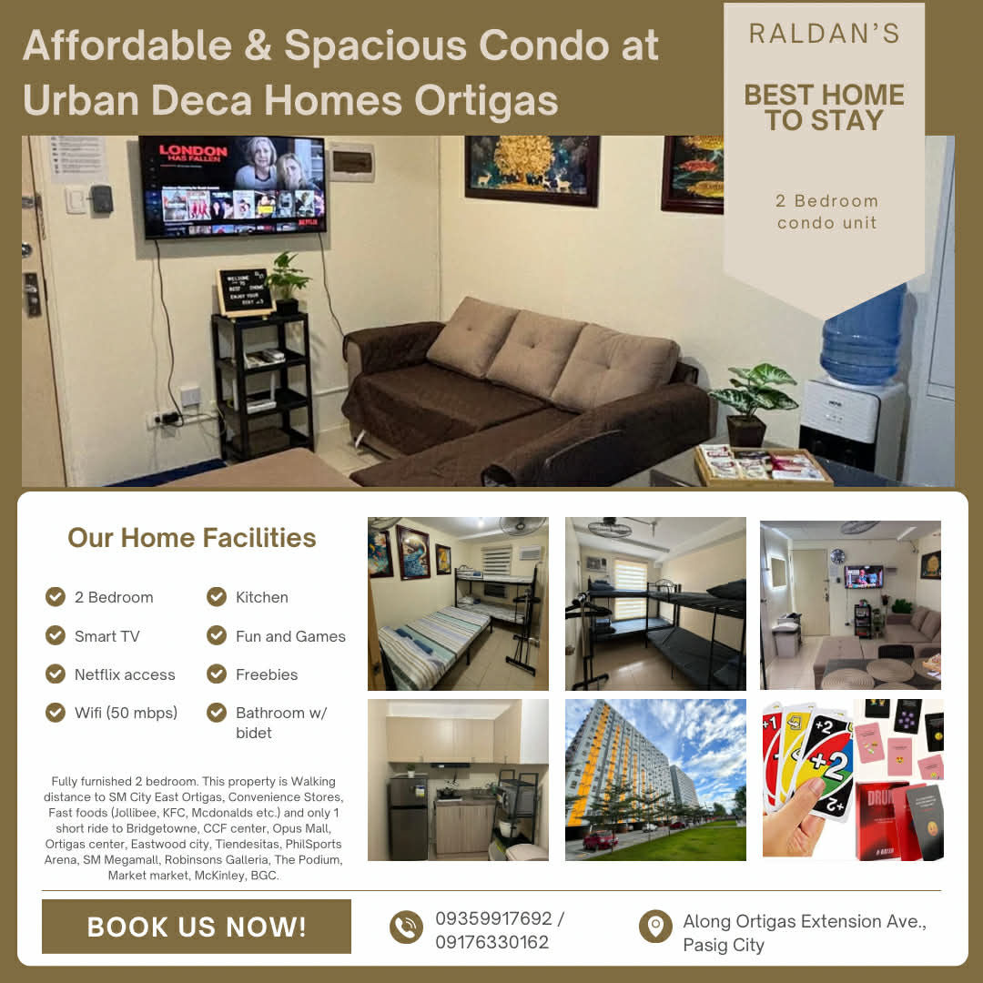 Tervetuloa viihtyisään, esteettisesti suunniteltuun 2 makuuhuoneen condohuoneistoon Urban Deca Homes Ortigasissa. Sijaitsee Pasig Cityn sydämessä. Yksikköön mahtuu jopa 10 vierasta. Suuremmassa makuuhuoneessa on queen-vuode, jossa on ulosvedettävä vuode, joka on ihanteellinen 4–5 hengelle. Toisessa makuuhuoneessa on kaksinkertainen kerrossänky ja ylimääräinen parivuoteen patja, joten huoneessa on tilaa jopa 6 vieraalle. Olemme myös ylpeitä siitä, että olemme lemmikkiystävällisiä! Ota mukaan jopa kaksi lemmikkiä nauttiaksesi majoittumisestasi luonasi.