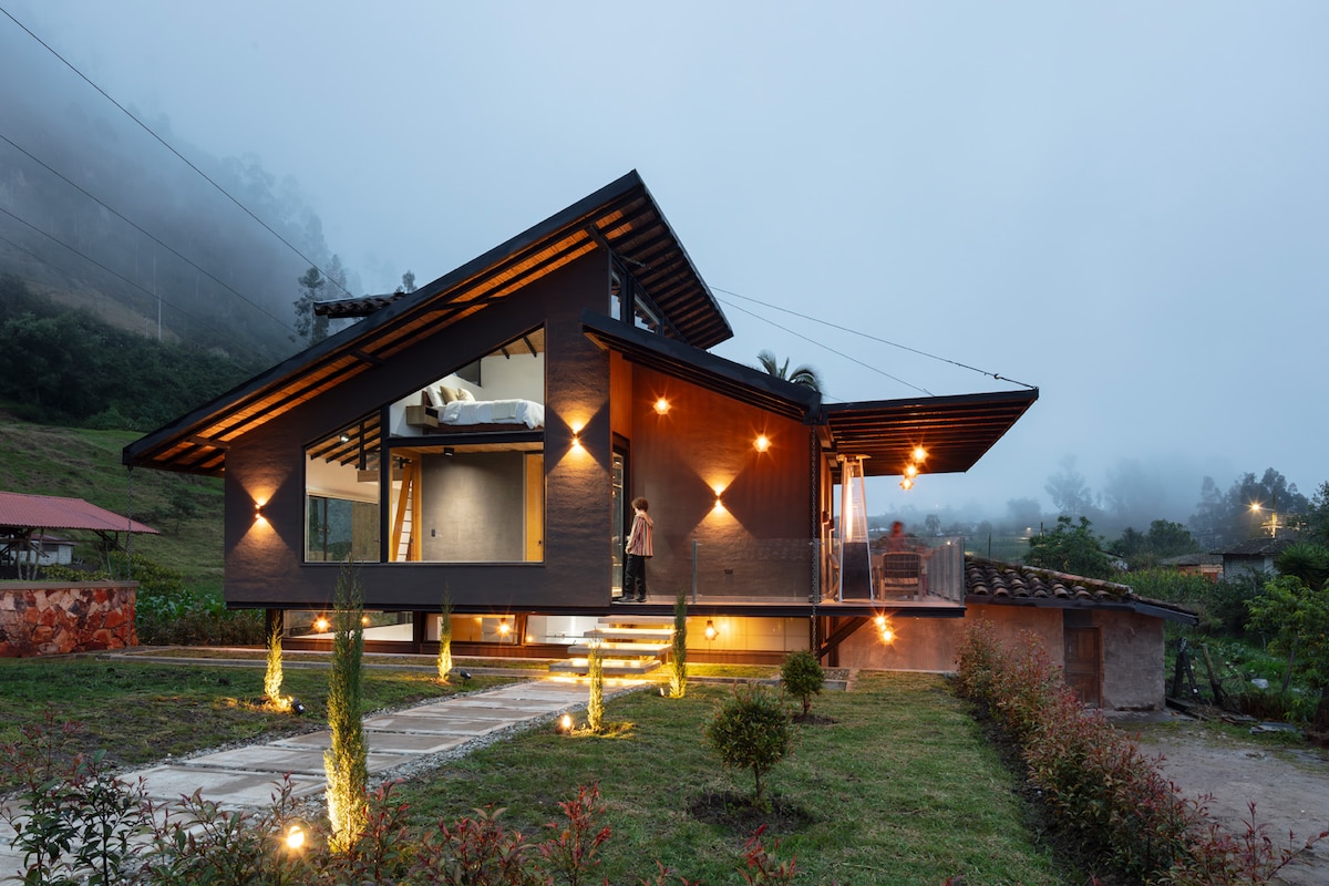 En Chukidel Ayllullakta, Comunidad de Lagunas Saraguro, rodeada de maizales y huertas, hemos construido para ti una hermosa casa cuyo diseño armoniza la ancestralidad con la modernidad. Sus paredes de tierra te abrazan y te protegen del frío andino, creando un ambiente cálido y acogedor. La estructura metálica permitió edificarla con seguridad sobre una falla geológica, mientras sus amplios ventanales te insertan en el paisaje y la vida de la comunidad.