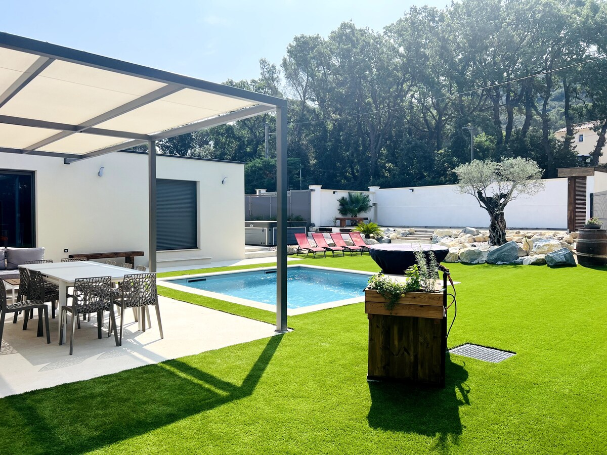 Tervetuloa yksityiseen keitaaseemme 1 tai 2 hengelle la roquetten sydämessä! Nauti trooppisten kasvien ympäröimästä lämmitetystä suolavesialtaasta. Tila tarjoaa sinulle varjon ja rauhallisen paratiisin. Nauti aamiaista, aperitiivia tai laita ruokaa uima-altaalla ulkoterassin keittiössä. Makuuhuone on ilmastoitu ja varustettu ylellisillä hotellin laadukkailla vuodevaatteilla ja luomuliinavaatteilla, jotta majoittumisesi olisi rentouttava ja ikimuistoinen.