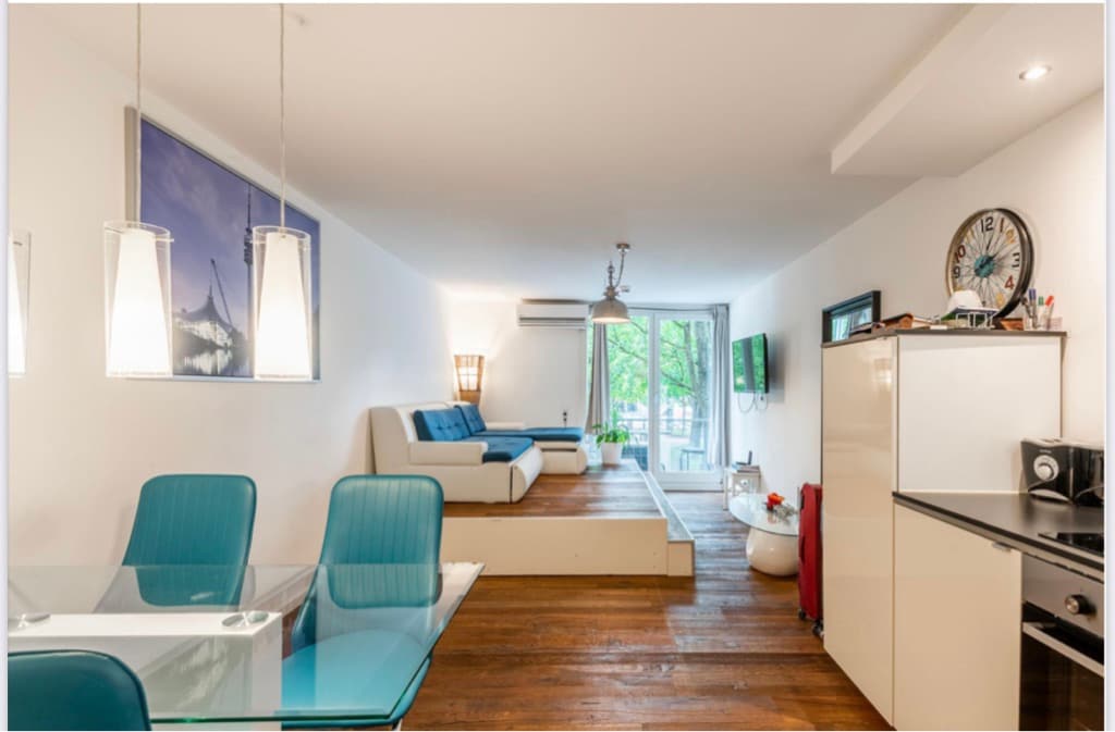 Discover the authentic feel of this revitalized historical space. The flat features Juliette balconies, a studio style main area with a guest bed (1.20m), wood flooring, and views of the side street below. Lehel is located between the old town and the Isar River, where locals enjoy summer days or strolls through the park. It is also close to restaurants, bars, shops and sights. On-site parking: €25 per night. Ask for availability.