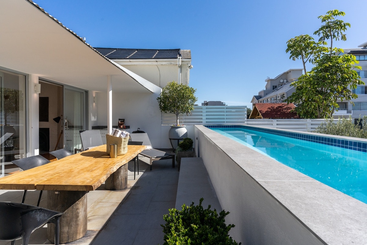 Come cool off in the sparkling pool of this three bedroom, modern chic contemporary villa. Centrally located in Cape Town City Bowl - Higgovale, situated on the slopes of Table Mountain. Clad almost entirely in timber and featuring floor-to-ceiling sliding doors, the indoor-outdoor experience of this home is exceptional. Free high speed fiber WiFi and secure parking for two cars. We have an inverter and Lithium battery to assist during loadshedding. A serene pad in the city. We Welcome you!!