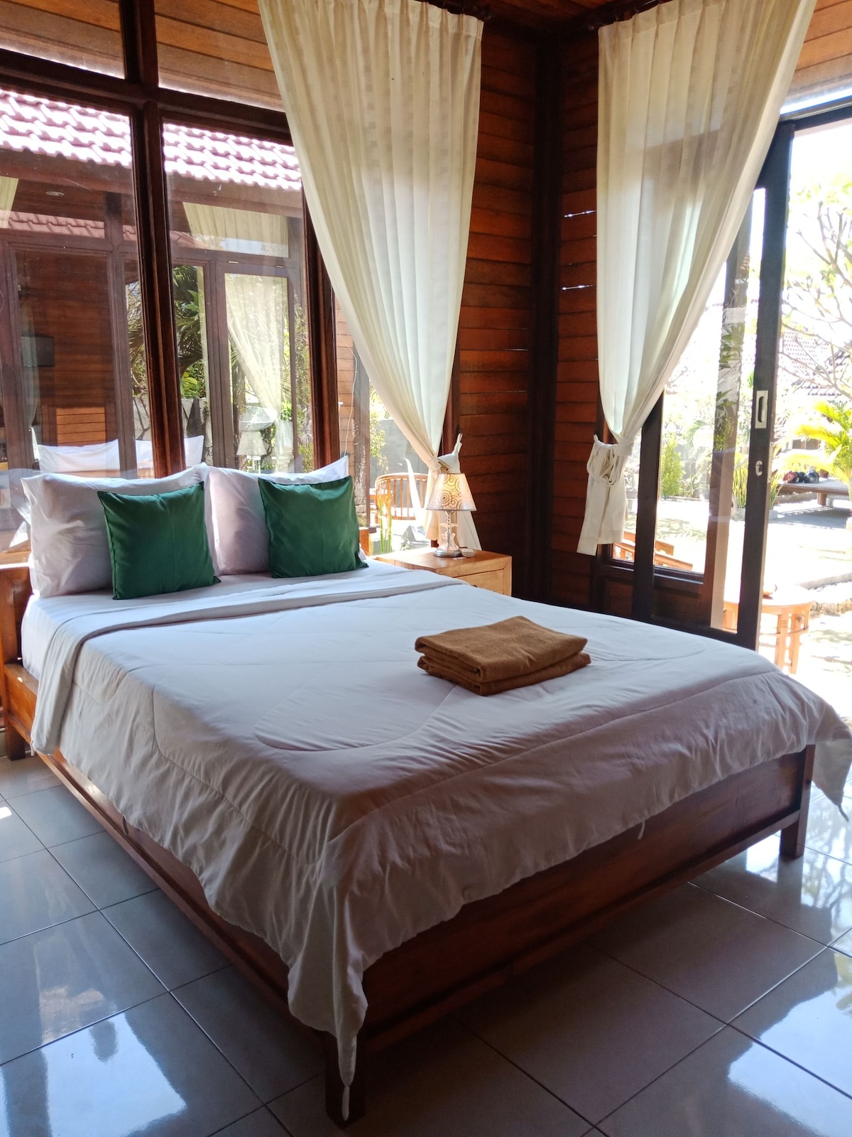 MERENRANNAN BUNGALOW Se on kuin palaisimme kotiin – vieraat kertovat meille, ja juuri niin haluamme vieraidemme tuntevan! Perheyritys 1 km itään Ujung Water Palacesta, Karangasem East Bali. On olemassa 2 huonetta merinäkymällä ja 2 puutarhabungalowia. Lisäksi tarjolla on 2 puutarhabungalowia, jotka sijaitsevat rehevissä trooppisissa puutarhoissa, joissa on kattotuulettimet, parivuode, oma wc/kylpyhuone, jossa on kuuma/kylmä vesi. Täydellinen ravintolapalvelu ja uima-allas kirjaimellisesti meren vieressä !!!! Vaikka olemme perinteisessä balilaisessa kylässä, olemme 10 minuutin päässä Amlapuran pääkaupungista, jossa on modernit pankkiautomaatit ja suuri supermarketti. Useimmat mielenkiintoiset rannat tai aktiviteetit ovat alle tunnin päässä. Sukelluksen snorklausretki ja pyöräily voidaan järjestää @ Kebun Impian sekä kulttuuritoimintaa + ruoanlaittokurssi. Kebun Impianilla on oma hieroja + kosmetologi, joka tarjoaa erilaisia kauneushoitoja. Kebun Impianin omistaja/majoittaja on Ni Wayan Kusumayanti Ocean-bungalow sijaitsee rehevissä trooppisten puutarhojen keskellä, ja siitä on näkymä salmeen. Siinä on 2 terassia, suuri makuuhuone (5 m x 5 m), jossa on queen-vuode ja yhden hengen vuode. (Lisäksi voidaan lisätä yksi yhden hengen vuode). Siinä on yläpuolella tuuletin tai ilmastointi. Tämä johtaa kylpytakkeihin ja sisä- ja ulkosuihkutilaan. Sisäuihkussa on kuumaa + kylmää vettä ja vain ulkosuihku, raikas vesi. ILMAINEN WIFI