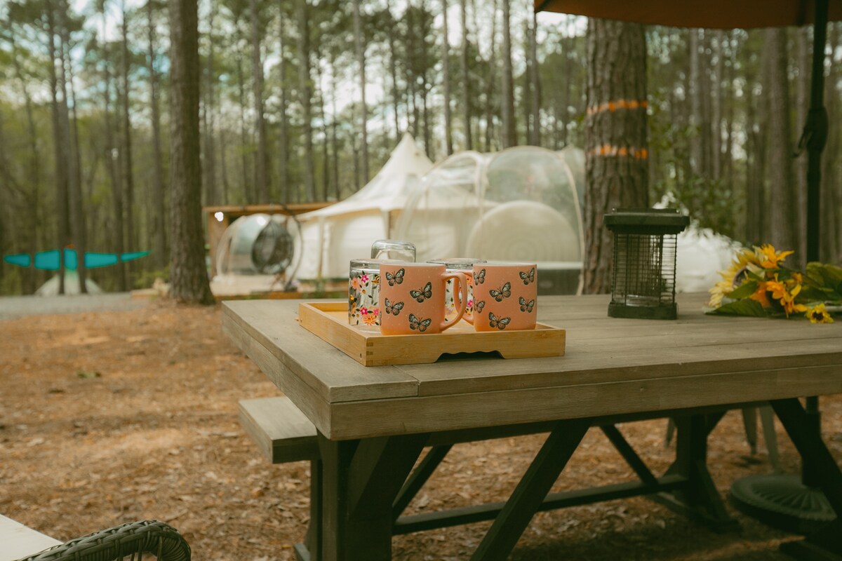 Huomaathan, että tämä on luksustelttailupaikka, ja muita vieraita voi olla kohteessa majoittumisesi aikana. Koe ylellinen luksustelttailu Itä-Teksasin kauniissa Piney Woodsissa. Täydellinen niille, jotka haluavat mukavuutta kuin sen karkeuttamista, ylellinen telttamme 5 hehtaarin suuruisella perhekodilla tarjoaa upeat näkymät ja modernit mukavuudet. Nauti viihtyisistä nuotiopaikoista, kuumista suihkuista, ulkokeittiöstä ja rentouttavista riippumatoista. Olemme vain 14 minuutin päässä Atlanta State Parkista ja 30 minuutin päässä Caddo Lakesta ja Jeffersonista, Texasista.