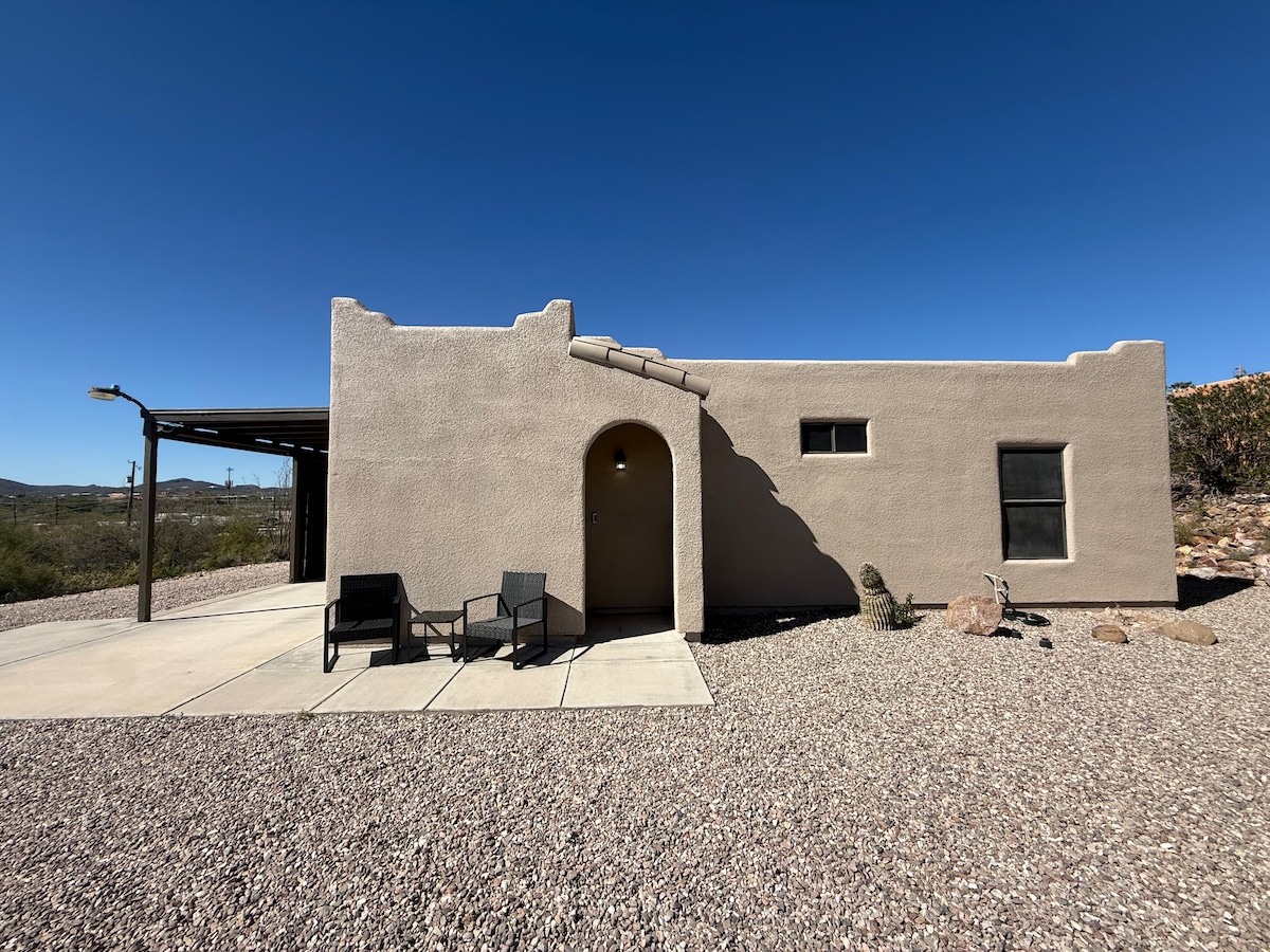 Vetäydy tähän rauhalliseen 1 makuuhuoneen casitaan West Foothillsissä, joka sijaitsee viehättävällä 17 eekkerin kiinteistöllä. Nauti king-vuoteesta, ilmastoinnista/lämmöstä, täydellisestä keittiöstä, jossa on RO-vettä, jääkone, mikroaaltouuni, liesi/uuni, 65" Roku TV, jossa on 220 kanavaa, nopea wifi, pyykinpesukone/kuivain ja pelipöytä. ~800 neliömetriä mukavuutta ja viehätystä. Vain 2 mailia ylös Ironwood Hill Dr:ltä Silverbell Rd:ltä, 6 mailia UofA:han. Täydellisen puhdas ja kutsuva, täydellinen rauhalliseen lomaan. AZ TPT Lic 21337578
