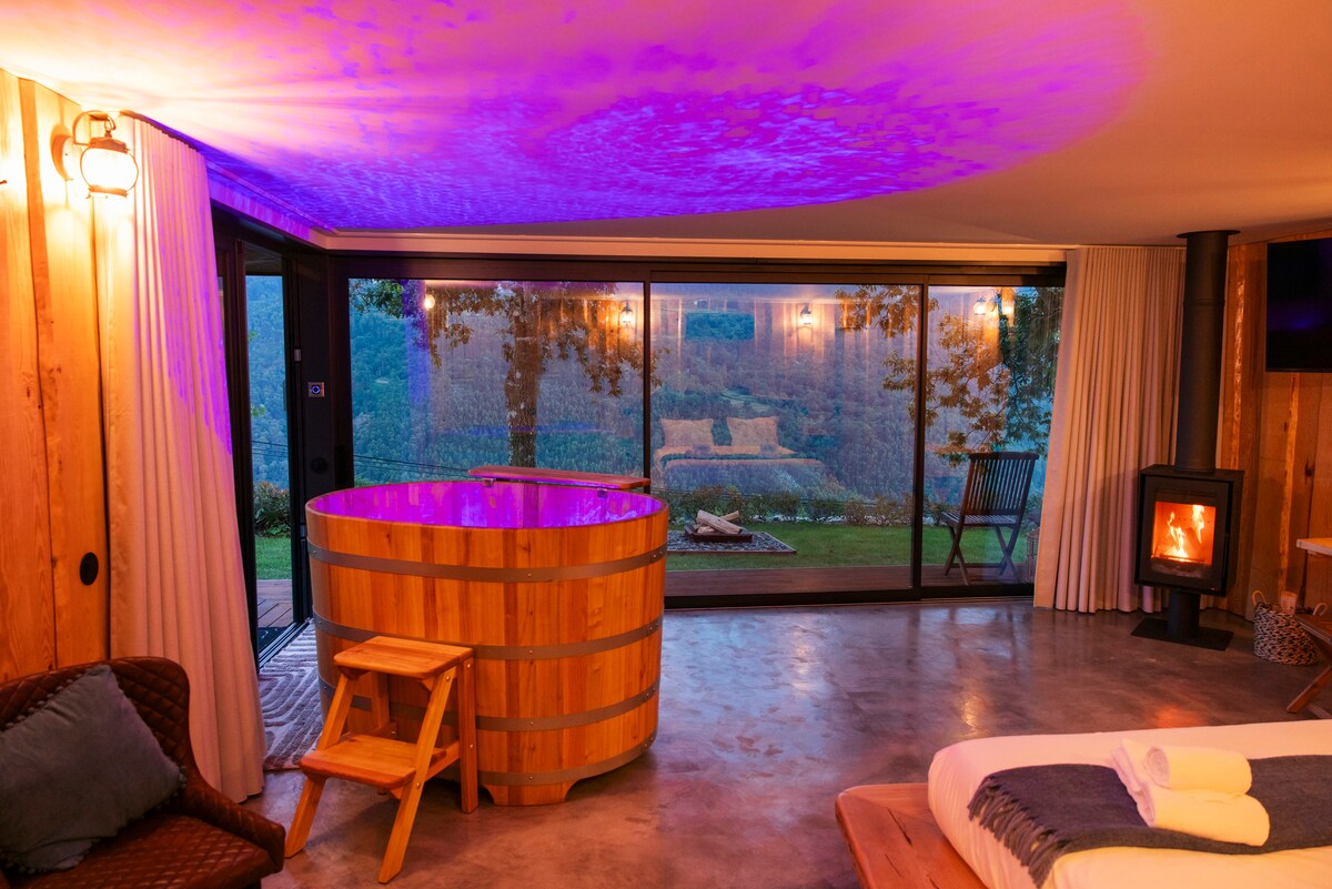 Panoraamaikkunat antavat tilalle tilavuuden tunnetta, päästävät luonnonvaloa sisään ja tarjoavat upeat näkymät. Siinä on olohuone, täysin varusteltu ruokailutila, erillinen makuuhuone, jossa on oma kylpyhuone ja suihkukaappi, kylpyhuone makuuhuoneessa ja poreallas ulkona. Monte dos Xistosin huvilat sijaitsevat vuoristossa viinitarhojen ja metsien ympäröimänä, 10 km:n päässä Guimarãesin historiallisesta keskustasta.