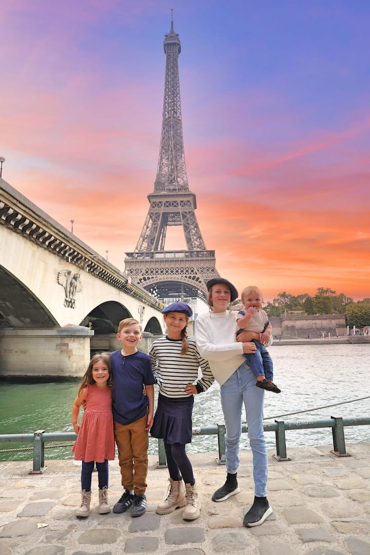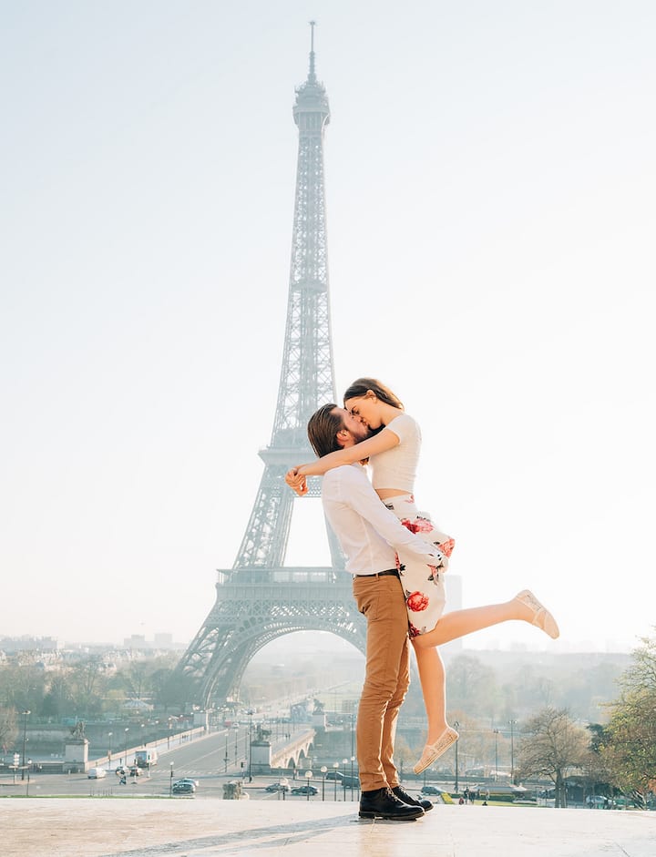 Romanttinen valokuvaus ikonisessa Eiffel-tornissa ja Seine-joessa.