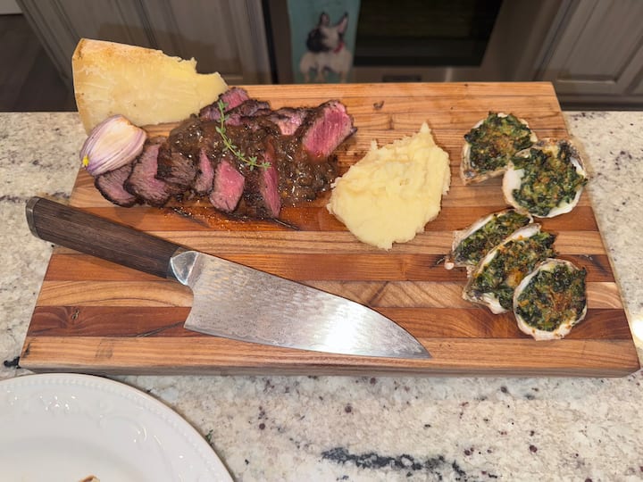 Esimerkiksi osterit Rockefellerin tapaan, kuivakäytetty ribeye, perunasose, vihannes voidaan lisätä. Jälkiruoaksi voi olla myös suklaatorttu.