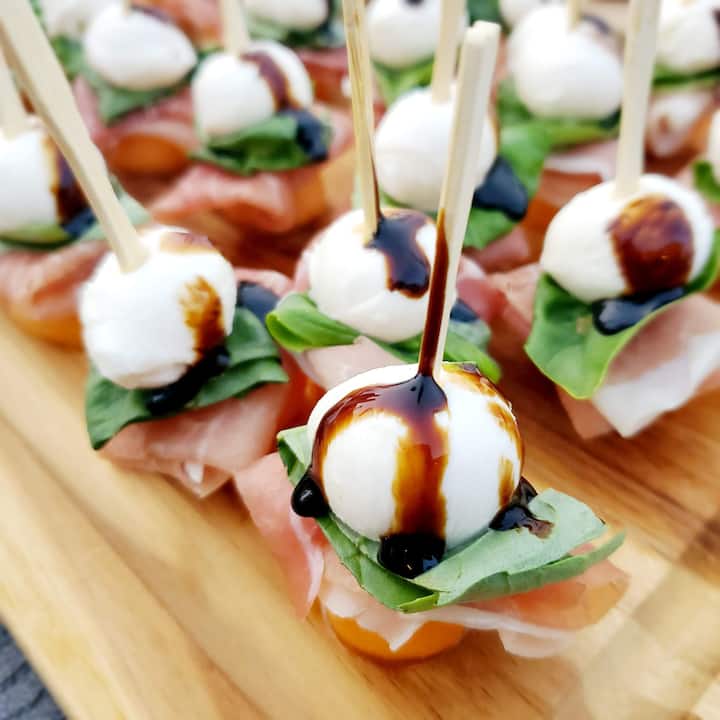 Caesar-salaattia, valkosipulikorppujauhoilla maustettuja kananmunia, caprese-varraspaloja ja kotitekoista basilikan pestoa