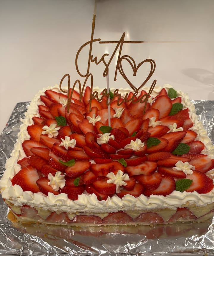 Mansikkakakku (sokeri, rommisiirappi, kevyt vaniljakreemi, tuoreet mansikat)