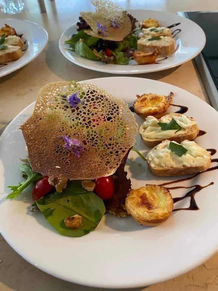 Vuohenjuustosalaatti (vuohenjuustoa minitortussa, vuohenjuustoa paahtoleivällä, viinirypäleitä, saksanpähkinöitä, parmesaanilastuja)