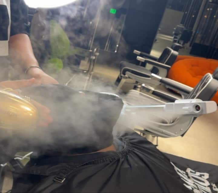 Tämä hemmotteleva parturi-kampaamoistunto alkaa shampoopesulla ja päänahan höyrystämisellä kuumalla pyyhkeellä. Rentoile leikkauksen jälkeen rauhoittavan kasvohieronnan parissa.
