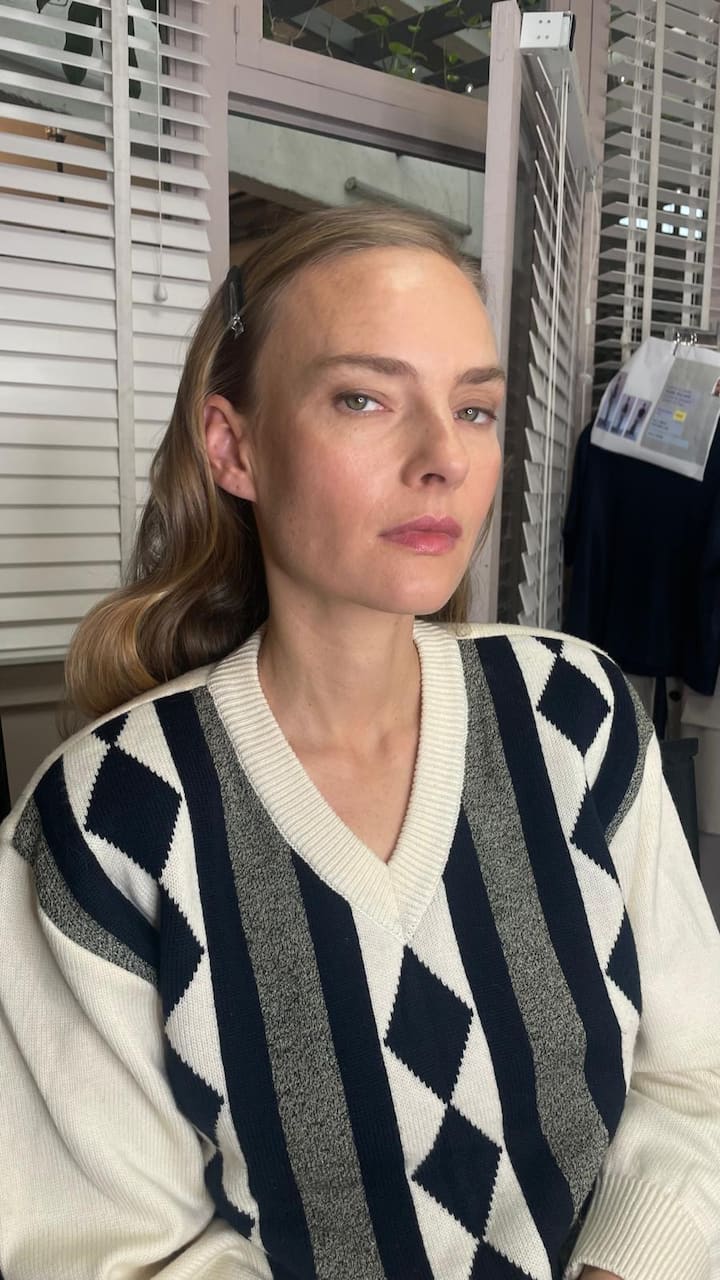Kaunis iho, hieman korostetut silmät, kauniit kulmakarvat ja luonnollinen suu.