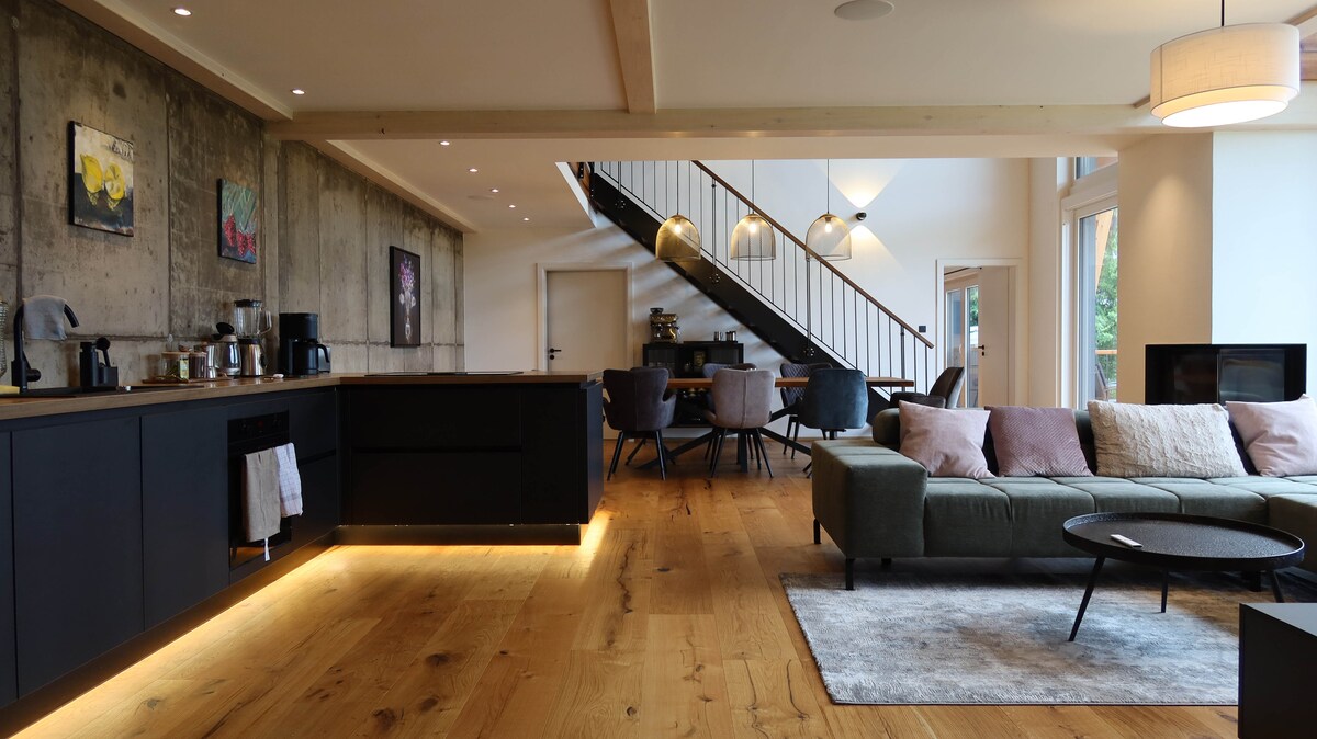 Das Chalet liegt am Fuße des Schwarzwaldes, mit freiem Blick auf Wiesen und Wälder und bietet auf 200m2 viel Platz für einen erholsamen Urlaub. Der Wohnraum ist mit Panoramafenstern und einer Galerie offen, hell und einladend gestaltet. Im Winter sorgt ein Kaminofen im Wohnbereich für die passende Atmosphäre. Vom großzügigen privaten Balkon führt eine Treppe in den Außenbereich, dieser besticht mit einem Infinity-Pool und freiem Blick auf Wald und Wiesen.