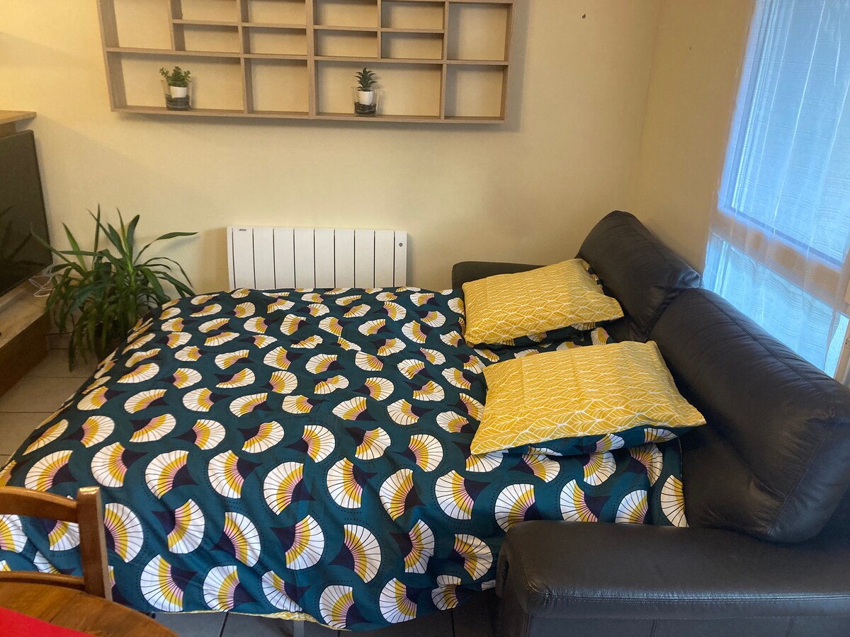 Itsenäinen 50 m2: n huoneistomme sijaitsee talomme pohjakerroksessa. Tässä tilassa on keittiö, joka on avoinna olohuoneeseen, ja 140 x 190 cm:n vuodesohva. Makuuhuoneessa on suuri mukava vuode, jonka koko on 180 x 200 cm, ja se voidaan jakaa kahteen vuoteeseen, joiden koko on 90 x 200 cm, mieltymystesi mukaan. Vuodevaatteet uusittiin maaliskuussa 2025 Emma 2 -hybridipatjoilla, jotka olivat Ranskassa ensimmäisellä sijalla vuonna 2024. Kirkas ja mukava majoitus, ihanteellinen pariskunnille, ystäville tai perheille.