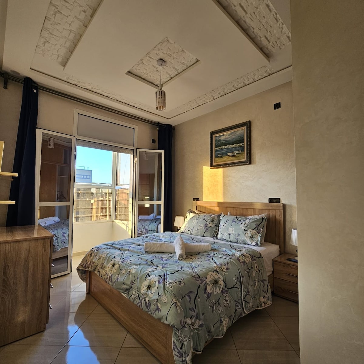 Ihanteellinen huoneisto perheille, pariskunnille tai liikematkailijoille. 2 makuuhuonetta: 1 parivuode 1 yhden hengen vuode Olohuone + ruokailuhuone (6 henkilöä) Varustettu keittiö, jossa on välttämättömyystarvikkeet Kuuma suihku, wc, peili, moitteeton puhtaus 2 parveketta + 1 terassi Ilmastointi, ilmainen WiFi, älytelevisio Hissi (huoneisto sijaitsee 1. kerroksessa) Hiljainen ja turvallinen naapurusto, 15 minuutin päässä Mehdian rannalta ja 5 minuutin päässä kaupungin keskustasta Yksityinen kuljettaja saatavilla pyynnöstä Skootterivuokraus