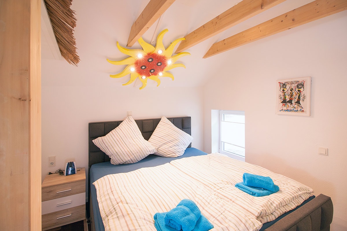 Patsada Cottage.................wo Gemütlichkeit Zuhause ist Der Wohnbereich besteht aus einer voll ausgestatteten Küche, einem Loungebereich, einem Essbereich und einer Toilette. In der oberen Etage, erreichbar über eine Wendeltreppe, finden Sie ein bequemes Boxspringbett (180x200), eine Schreibtischecke und ein großes Bad mit einer Rundtusche und einer weiteren Toilette. Sollten Sie mit mehr als 2 Personen anreisen besteht die Möglichkeit das Ecksofa in ein bequemes Bett umzuwandeln.