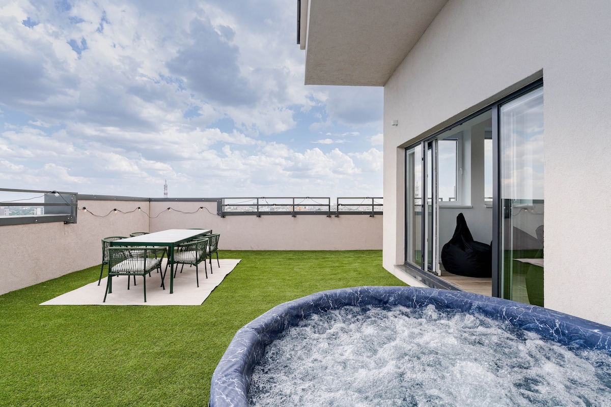 ***PESUALLAS ei sisällä VESIHIERONTA-toimintoa *** Tervetuloa Downtown Apartmentsiin! Tutustu ainutlaatuiseen, yksityiseen ja ylelliseen tilaan Bukarestin vilkkaassa sydämessä. Tämä tyylikäs kattohuoneisto tarjoaa sinulle ihanteellisen tasapainon kodin mukavuuksien ja hyvän sijainnin välillä. Siellä on ulkoporeallas, yksityinen terassi, rentoutumis- ja muuta-alue. Se sijaitsee 15 minuutin päässä Calea Victorieista, 25–30 minuutin päässä Otopenin lentoasemalta ja 35–40 minuutin päässä Therme Bukarestista.