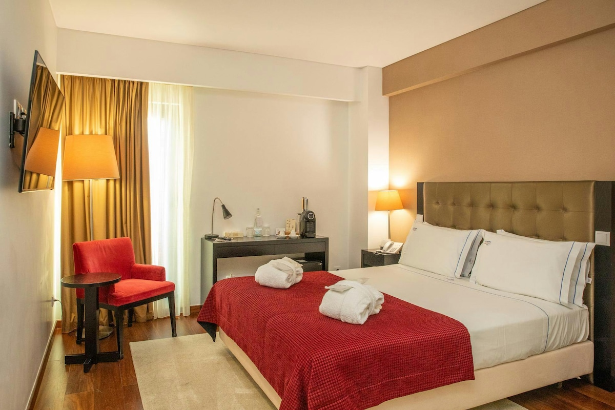 Welcome to Praia FLH Hotels, a charming hotel located in the heart of Ericeira, a small fishing village surrounded by beautiful beaches and some of the best waves in the world. Breakfast included and 24-hour reception. The Double Room with Pateo is 14m², with one double bed private bathroom, air conditioning, and TV.