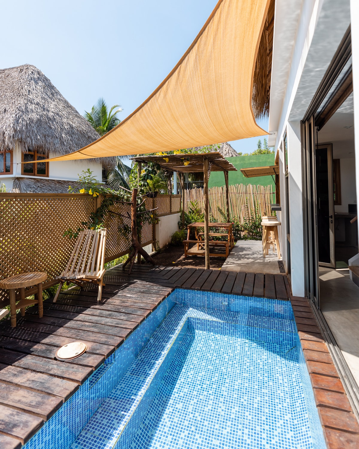 Escape to Cocoon, a private beach retreat designed for couples seeking for peaceful and romantic getaway. Just a short walk from the beach, this cozy suite blends comfort, privacy, and relaxed coastal charm. Your space features private plunge pool, AC, a sofa and a kitchenette with everything you need. Spend your days walking along the black sand beach, surfing or exploring the nearby restaurants and beach clubs all within walking distance. Enjoy sunsets that make this destination so special.