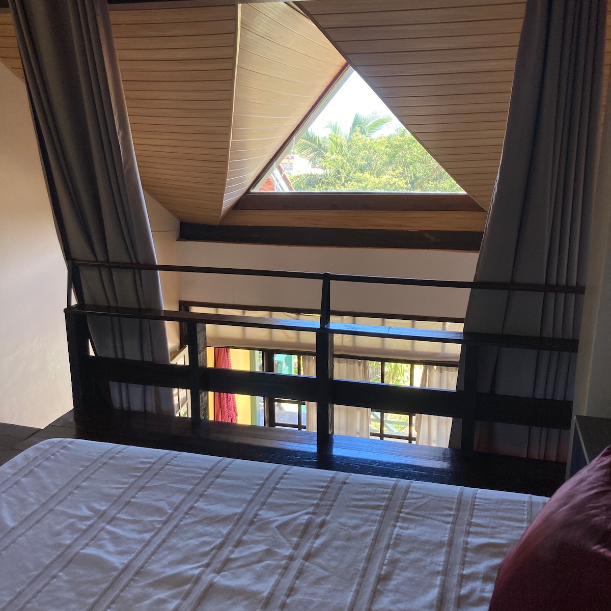 Talossa on 2 makuuhuonetta (jossa on väliseinä, suljettu voal-verholla), kannettava tuuletin, maalaistyylinen sohva, jossa on minibaari, ja oma kylpyhuone. Majoituspaikassa ei ole keittiötä, mutta vieraat voivat käyttää vierasmajan jaettua keittiötä (näkyy kuvissa) sekä olohuonetta, ruokailutilaa ja merinäköalaparveketta. Majatalossa on yhteensä 4 majoitusta. Se on kukkulan huipulla, ja sieltä on kaunis merinäköala. Sijainti (Praia do Siriú) - 1,3 km Siriú Beachin merestä - 9 km Garopaban keskustasta