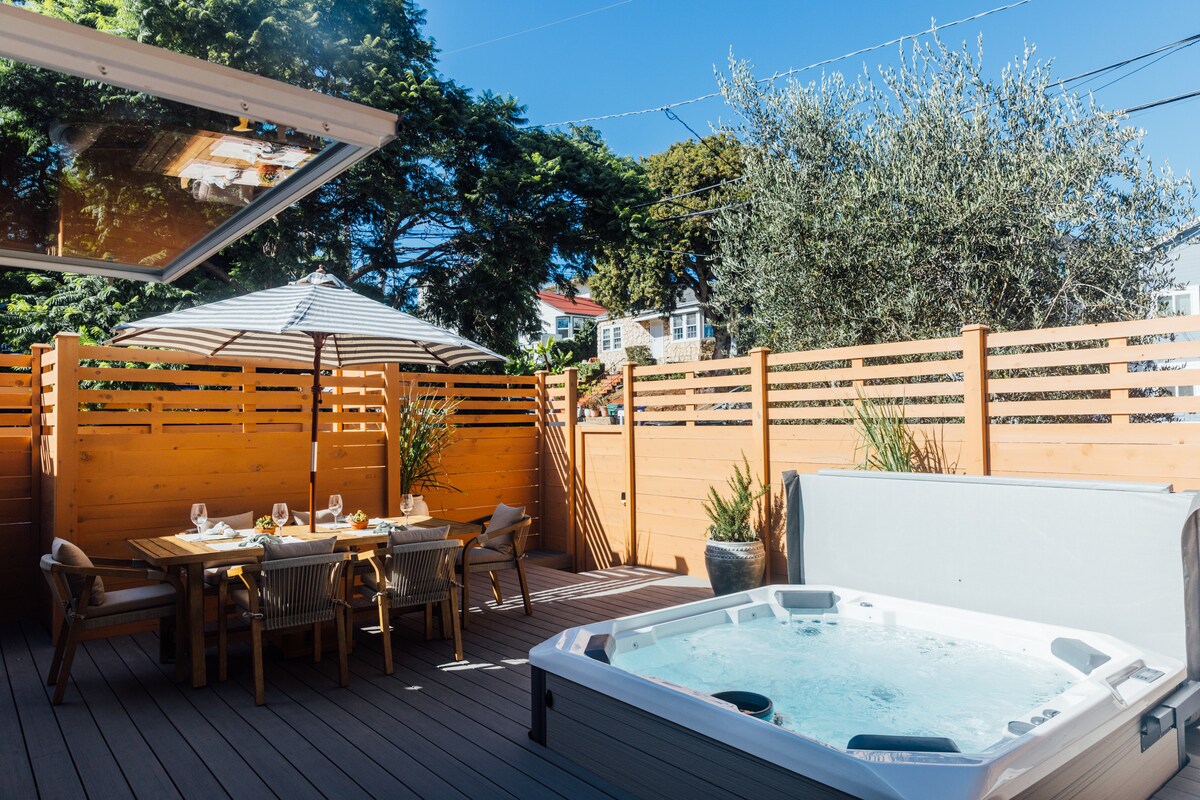 Right in the heart of Pacific Beach, a beautiful newly remodeled bright and airy home with 2 bedroom/2 bathroom, private yard and hot tub under twinkly lights. Walk to best that PB has to offer: restaurants, bars, yoga, coffee. Beach/bay less than a mile away. 1-car garage parking. After a day at the beach, come home to enjoy the fire pit, jacuzzi, play a game of corn hole, or enjoy a movie indoors on the cozy large couch. Always fully stocked coffee bar with premium coffees.
