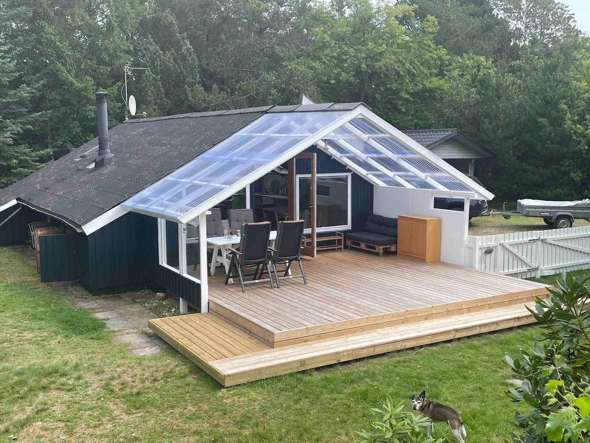 Vieraile tässä idyllisessä, täysin uudistetussa puisessa mökissä, jossa on ihana tunnelma. Sijaitsee syrjäisellä paikalla suurella kumpuilevalla metsäalueella Skuldbølissä. Mukava ja rauhallinen paikka, jossa on luonnonkauniit ympäristöt ja runsas eläimistö. Uusi suuri terassi katoksella keskellä metsää. Kävelyetäisyys 8 min. raittiiseen ilmaan Ringkøbingin vuonolla. Viehättävä talo tarjoaa kauniin luonnon sisällä ja on mukava valoisa sisustus, joka kutsuu viihtyisään ja rentouttavaan lomaan. Kauniit terassit luovat rauhaa ja tunnelmaa.