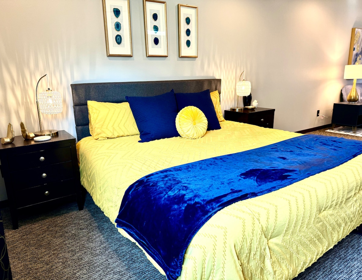 Iloinen koti, jossa on sisätiloissa takka ja king-vuoteet