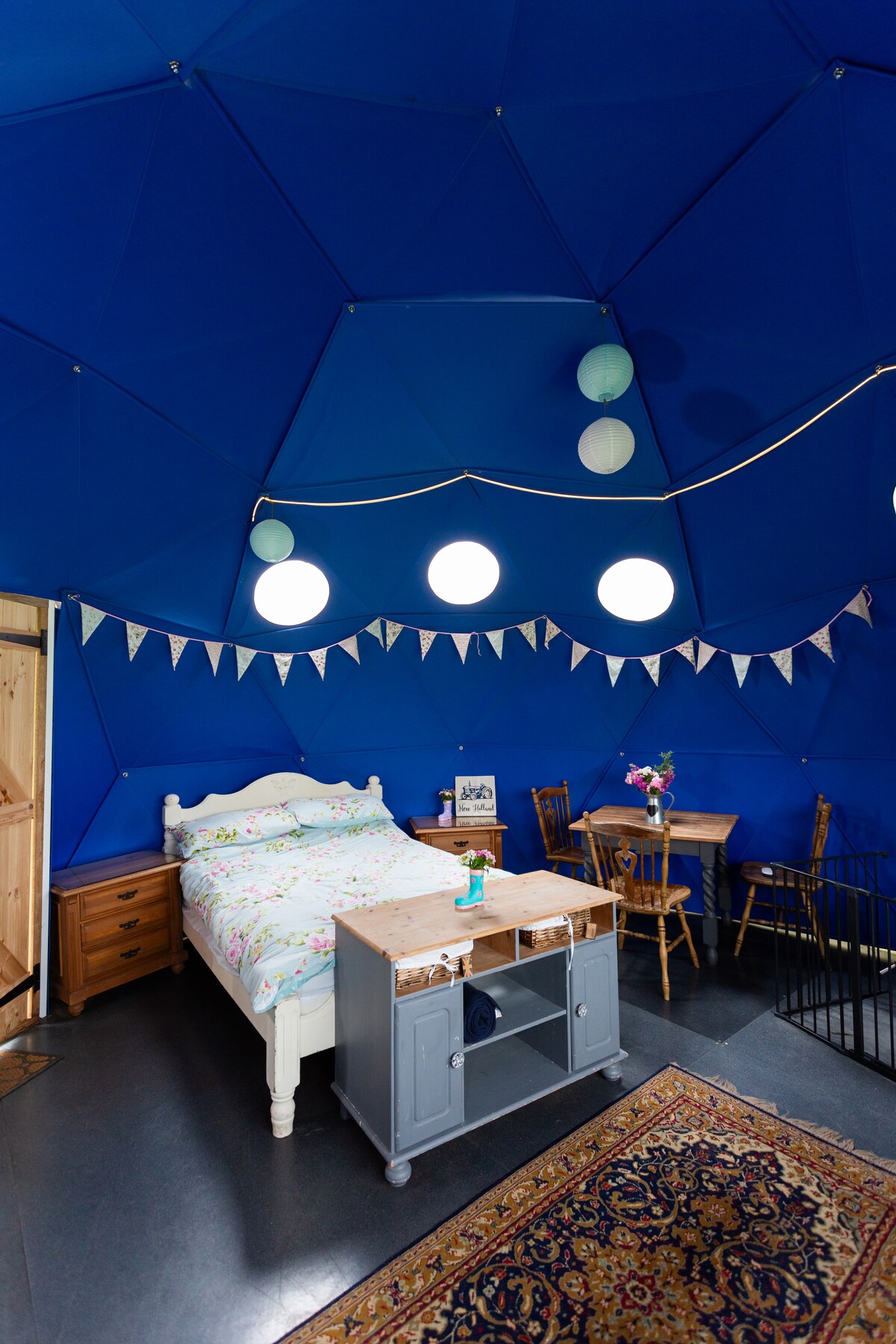 New Holland Dome sijaitsee 6 hehtaarin niityllä, ja olemme tehneet luksustelttailusta perheen kanssa mahdollisimman helppoa! The dome sleeps 5 in 2 double beds and a single bed and has a outdoor kitchen attached with a private flushing toilet. Lyhyen kävelymatkan päässä on täysin yhteinen keittiö ja oma suihkuhuone, jossa on pelihuone ja pehmeä leikki. Meillä on 2 ulkoleikkialuetta lapsille sekä aarrejahti ja metsänveistospolku. Vuodevaatteet sisältyvät hintaan, sinun tarvitsee vain ottaa mukaan omat pyyhkeet.