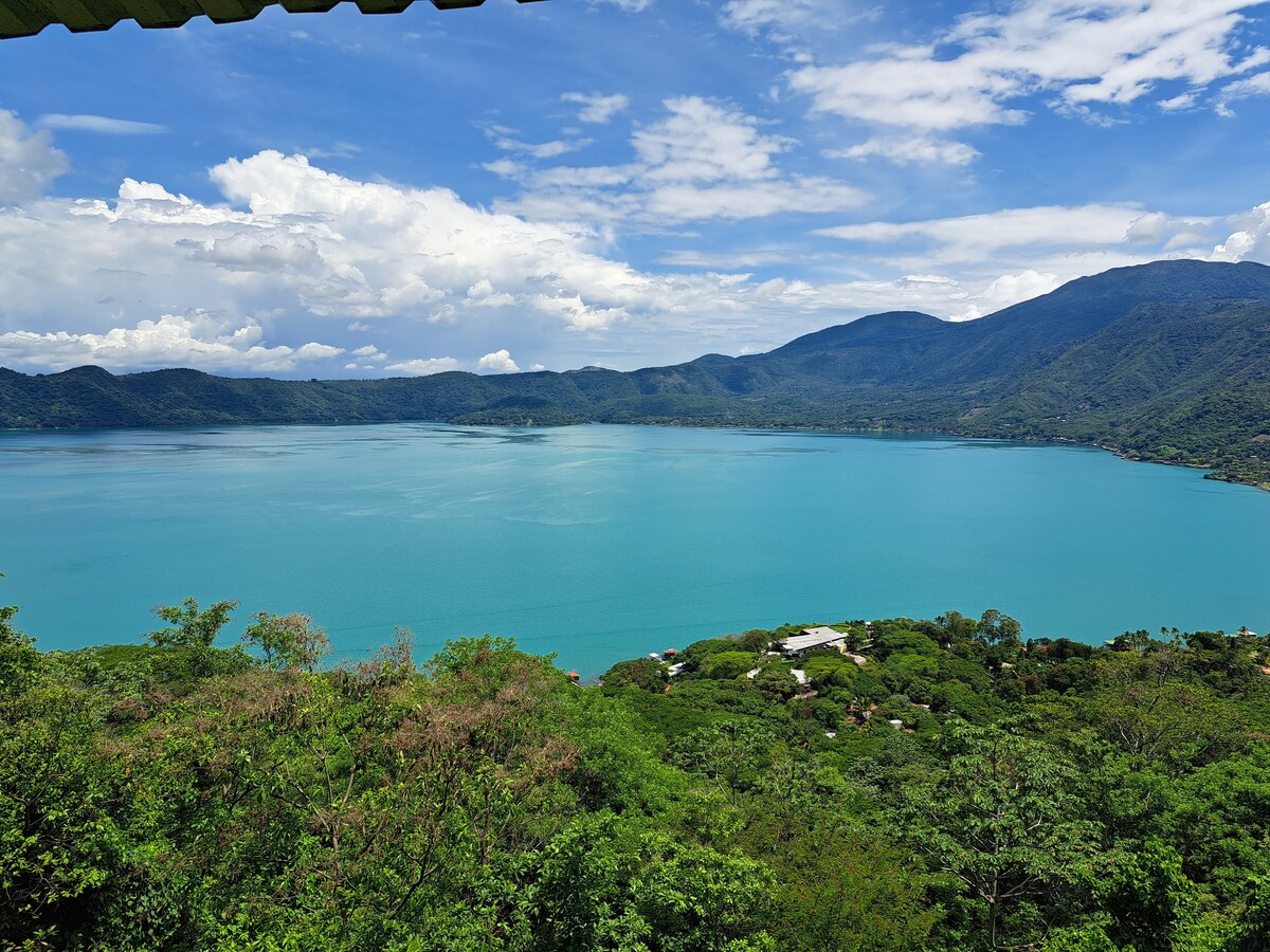 Mökki, josta on näkymä Coatepequen järvelle ja vuorille