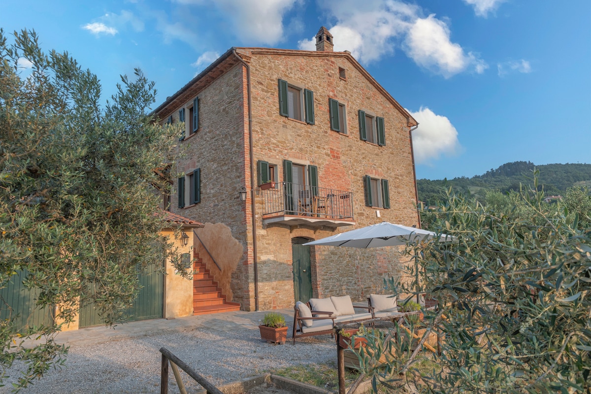 Umbrialainen maalaistalo järvi- ja oliivitarhanäkymällä