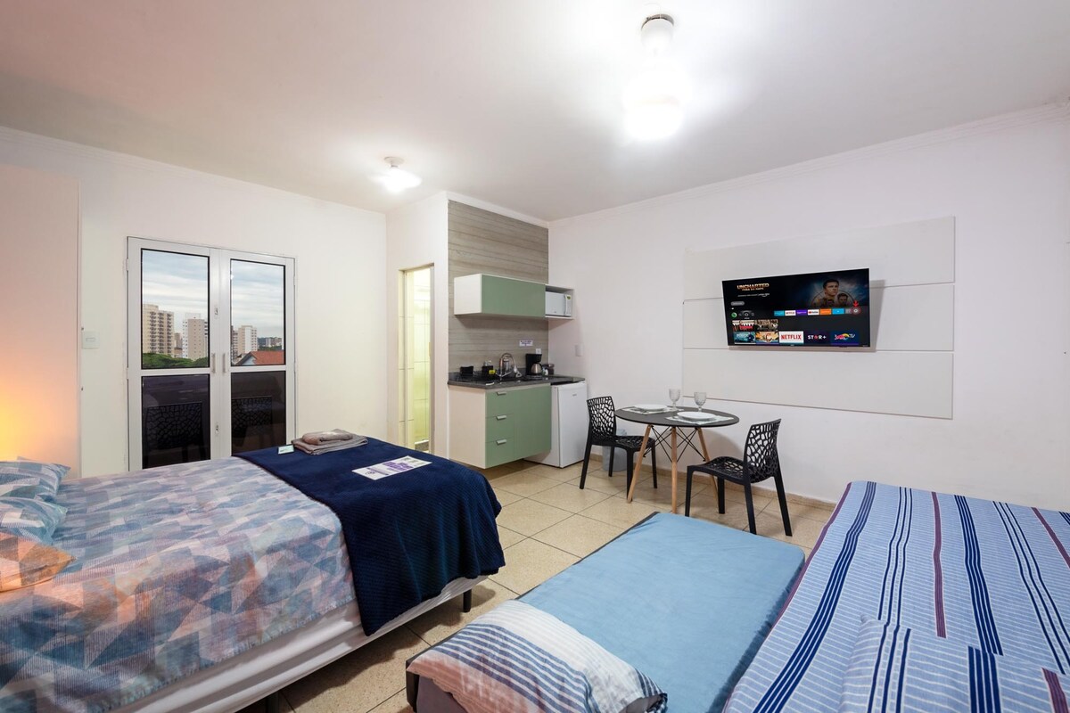 Perfeito para descanso ,em local tranquilo e seguro. Não temos vaga de garagem , mas o local é em rua tranquila e sempre tem vaga em frente ao prédio. Com utensílios na cozinha para um preparo de algo rápido. Temos também ferro de passar e ventilador. Temos cama de casal e caso necessário temos também um colchão extra para acomodar até 3 pessoas. Oferecemos roupa de cama e banho. O flat fica no primeiro andar e não temos elevador.