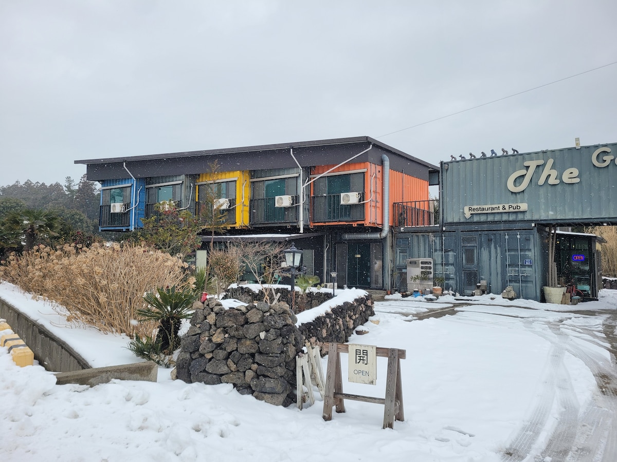 Sinisen huoneen konttitalo muistuttaa Jejun vehreyttä